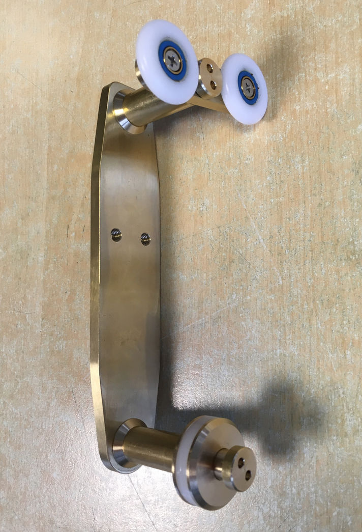 Brass hangers designed to hold a plate glass door. Installed in a flat in the Barbican, London.