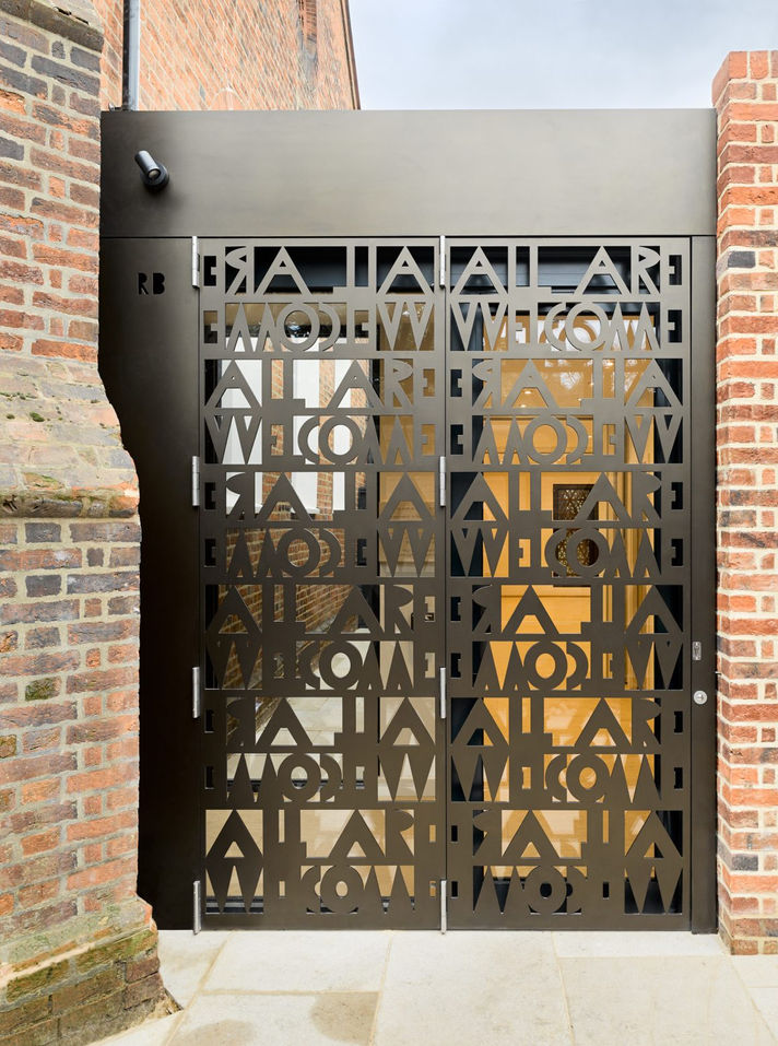A set of stainless steel hinges designed to support large steel gates. Installed at St. Peter's church, Richmond, London. Images courtesy of Hugh Cullum Architects.